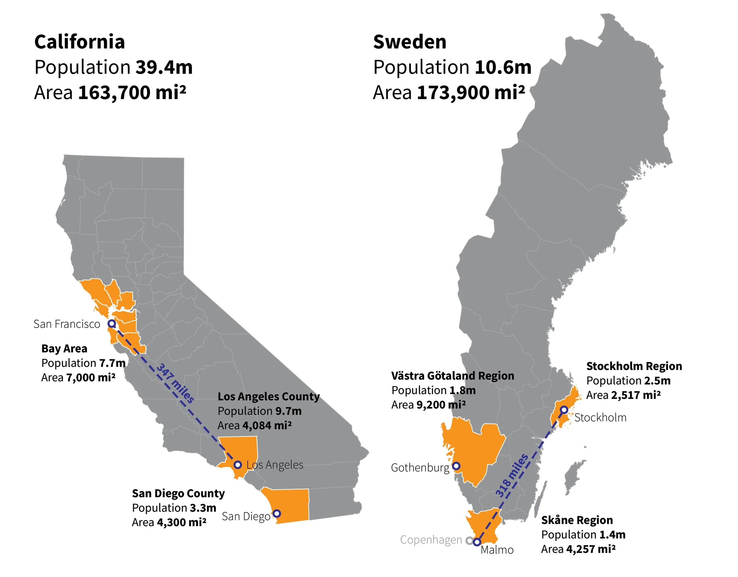 While Sweden and California differ in many ways, one reason Sweden provides a compelling comparison for California is because of its vast geography and relatively sparse population. The country is slightly larger than California but has only a quarter of its population — making it even more challenging to serve efficiently with longer distance transit. Like California, Sweden has large distances between major cities and expansive regions combining urban, suburban, and rural areas. The distance between Stockholm and Malmö is similar to that between San Francisco and Los Angeles.