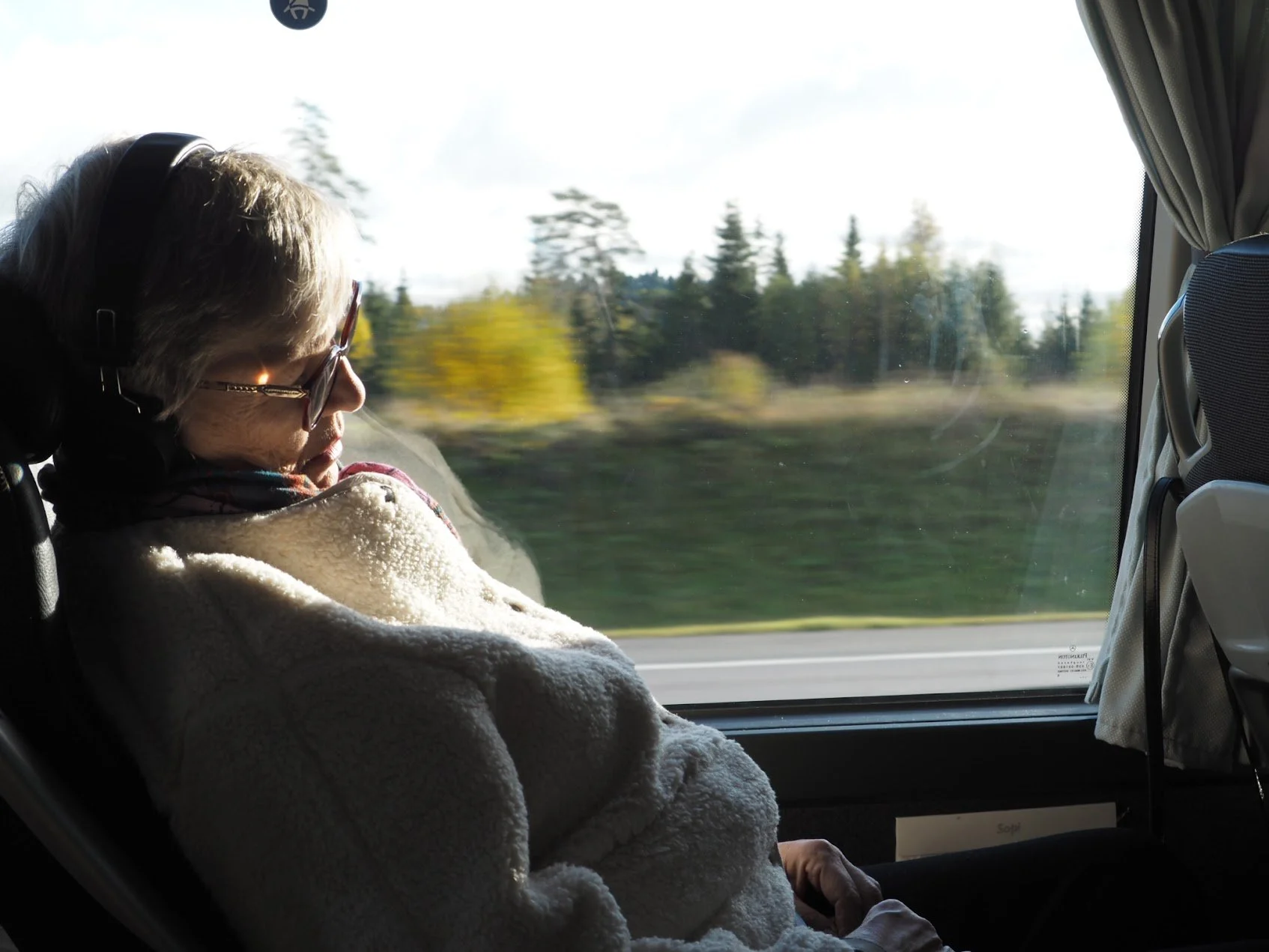 A passenger peacefully sleeping aboard the Vy intercity bus.