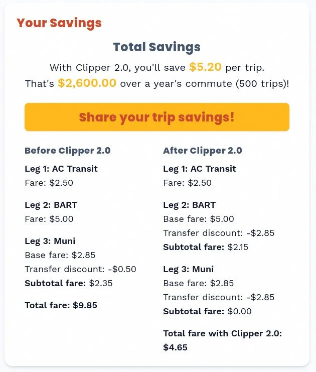Transbay Coalition and Seamless Bay Area have put together a Clipper 2.0 Savings Calculator to help you learn how much you can save on your commutes or other trips that use multiple agencies.