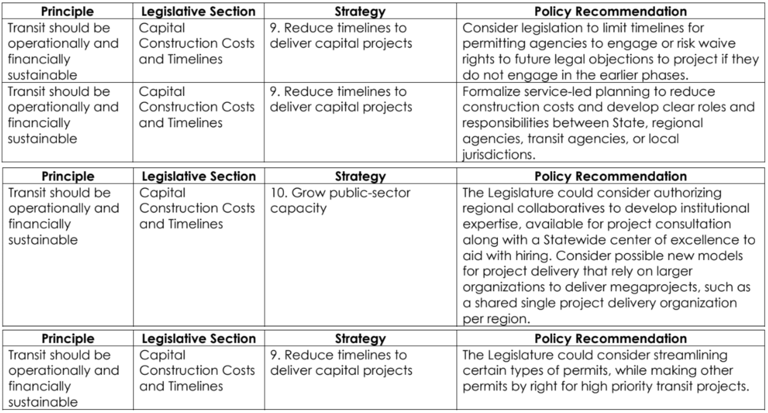 The Task Force discussed and the report included multiple recommendations to reduce cost and speed delivery of capital projects across the project lifecycle. California pays more than twice the cost to expand the system as other countries around the world, and the high costs are worsened by processes that result in very slow delivery of projects.