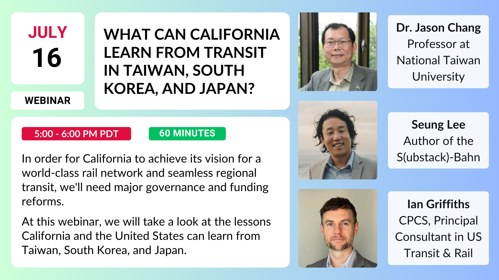 Webinar: What can California learn from transit in Taiwan, South Korea, and Japan | July 16th, 5:00pm - 6:00pm (PDT)