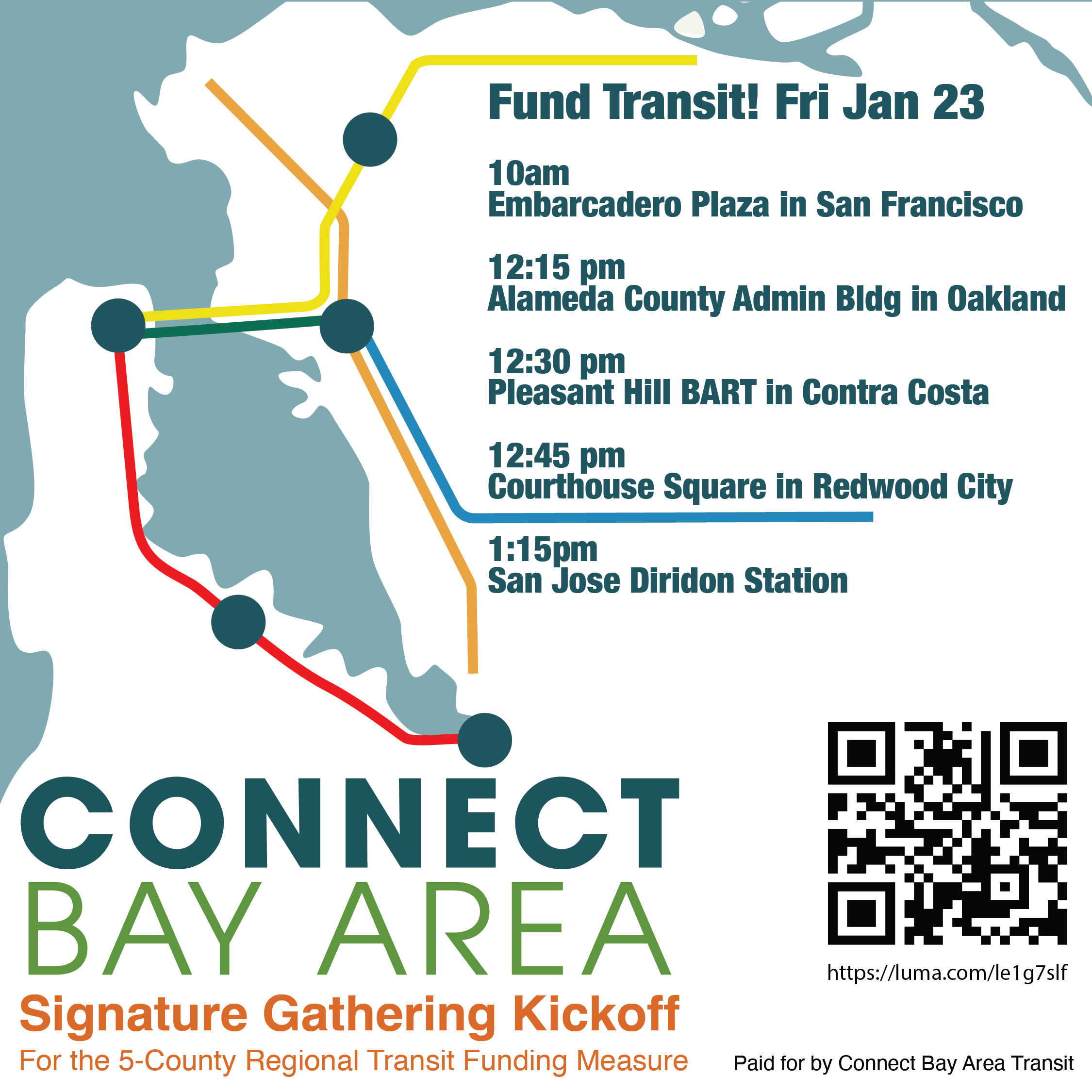 But we can solve this problem together. Come to the kick-off rallies for the Connect Bay Area ballot initiative this Friday, January 23rd, with events in San Francisco, Oakland, Pleasant Hill, Redwood City, and San Jose.