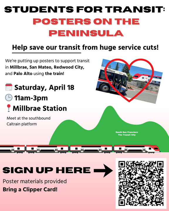 Hey Students! If you’re under 18 you can’t gather signatures, BUT you can still help save our transit. Join us Saturday, April 18, 2026 at 11:00 AM for at the Millbrae Caltrain station to learn about the campaign and help with postering. The event is led by local college and high school students and will head southward along the Caltrain corridor. Please bring your Clipper Card. Read here for more details.